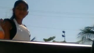 Alison Angel flashes her hairless coochie in outdoor public scene