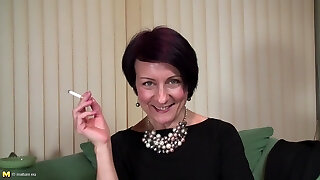 Ravishing mature babe with shaved fuckbox fumbling it in an robust solo shoot