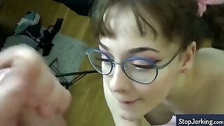 Nerdy milf diligently guzzles heavy cock until blessed ending on face
