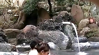 Japanese milf joined in the outdoor baths by a pussy gobbling guy