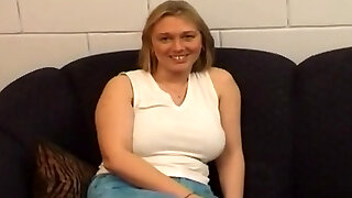 Chunky blonde with huge mounds Porsche orgasms on a raging dick