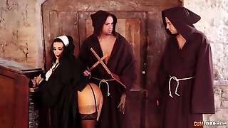 Threesome fucking with a gorgeous nun finishes with a double facial